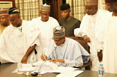 President Muhammadu Buhari on Wednesday signed the 2018 N9.12 trillion Appropriation Bill into law in the absence of the Senate President Bukola Saraki and the Speaker of the House of Representatives, Yakubu Dogara.