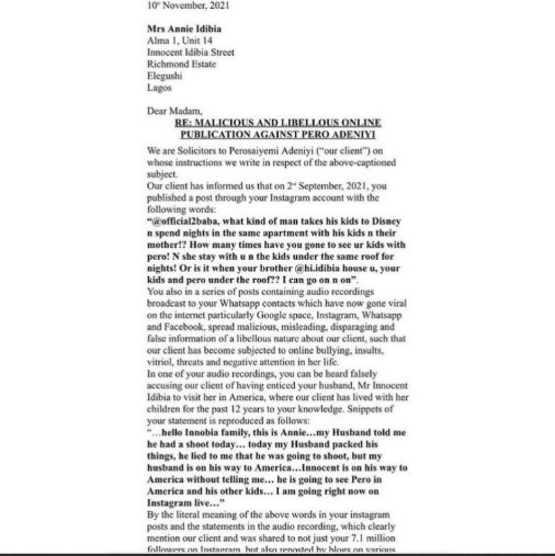 Pero Adeniyi, a babymama to Nigerian singer, Innocent Idibia a.k.a TuBaba has served a lawsuit notice to his wife, Annie Idibia over alleged defamation of character.