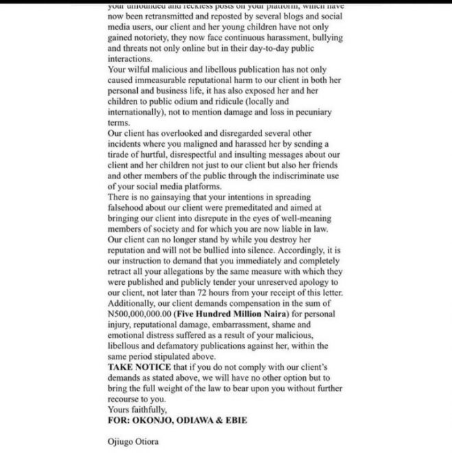 Serving Annie the lawsuit notice on her birthday through her lawyers, Pero demanded a retraction of the actress’ claims and the sum of N500m as damages.