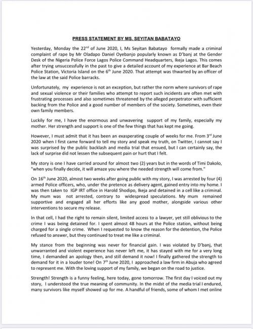 In a press statement, Seyitan said she filed the criminal complaint at the Gender Desk of Lagos Police Command Headquarters in Ikeja on 22 June.
