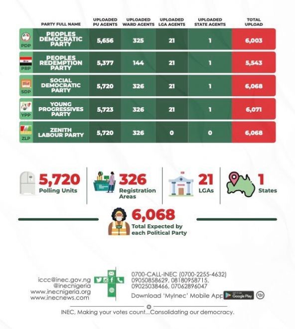 He said: ” In line with the Commission’s avowed commitment to deepen the use of technology in elections, a dedicated portal was designed for political parties to upload the names and other details of their Polling Agents for Polling Units and all the three levels of collation (Registration Areas/Wards, Local Government Areas and State collation). A detailed breakdown of the submissions by political parties has been uploaded to the Commission’s website and social media platforms for public information.