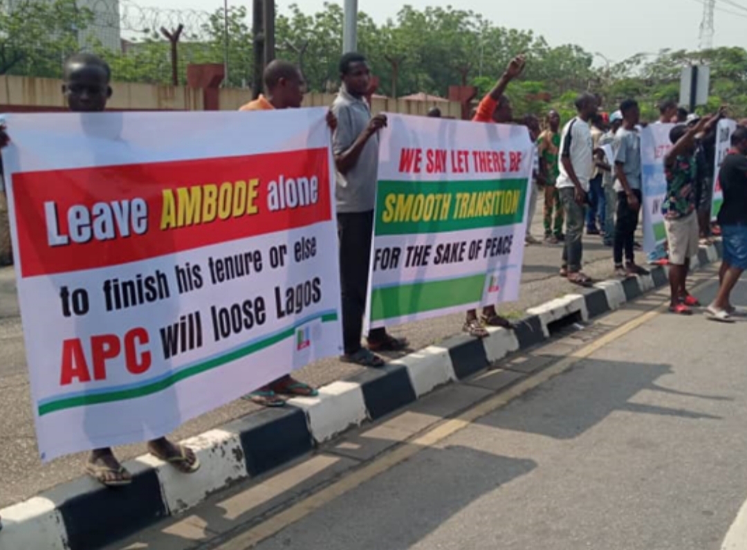 The men and women, who carried banners with inscriptions of their agitations, said the removal of Ambode would disrupt the peaceful conduct of the general elections.