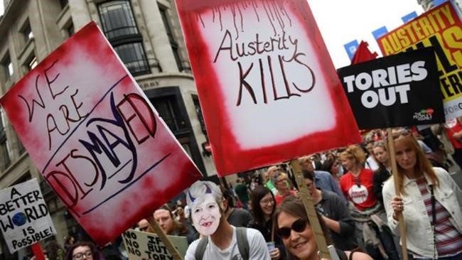 The rally was organized by the People’s Assembly Against Austerity, which earlier said in an online statement that they “need to make sure” the opposition to the government is felt.