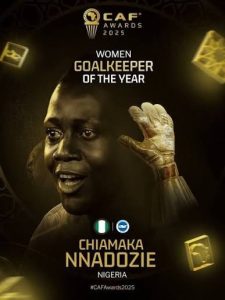 Chiamaka Nnadozie received the Women’s Best Keeper award for the third time in a row at the 2025 CAF Awards.