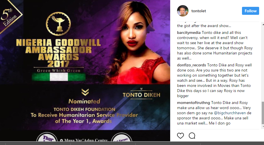 Tonto Dikeh made the announcement that she will be awarded at the event and nigerians react on the Instagram post while some took to their twitter account to express how they feel about this…