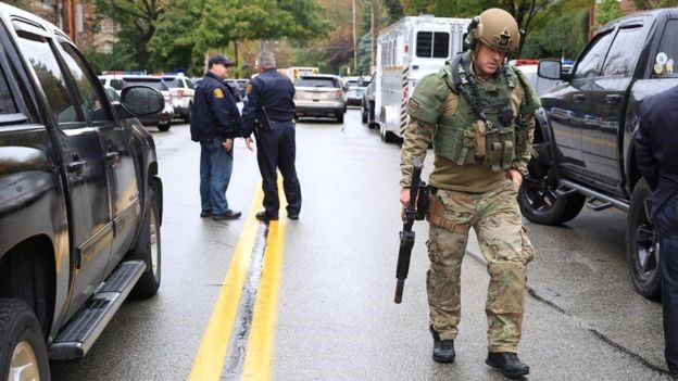 According to reports Mr Bowers, a white male, entered the building during the Saturday morning service armed with an assault rifle and two pistols.
