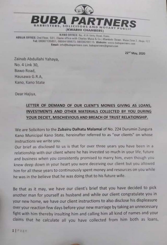 Lawyers of Zubairu Dalhatu Malami, the former boyfriend of Zainab Abdullahi Yahaya (the new wife of Customs boss, Hameed Ali) have written her to demand a refund of N9.1 million, being refunds of various investments he made on her.