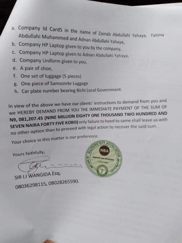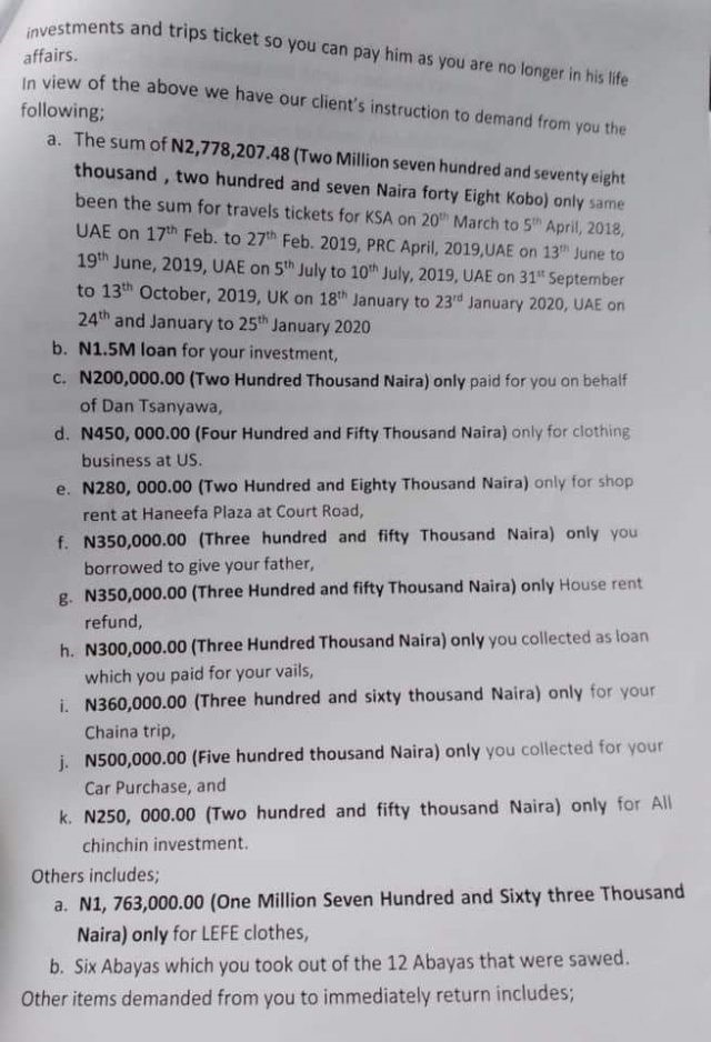 Lawyers of Zubairu Dalhatu Malami, the former boyfriend of Zainab Abdullahi Yahaya (the new wife of Customs boss, Hameed Ali) have written her to demand a refund of N9.1 million, being refunds of various investments he made on her.