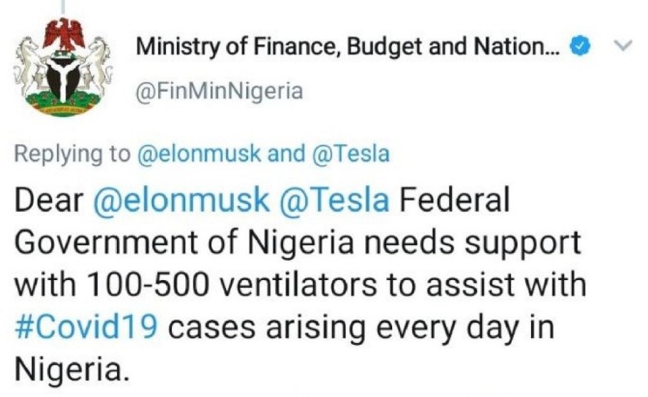 “Dear @elonmusk @Tesla Federal Government of Nigeria needs support with 100-500 ventilators to assist with #Covid19 cases arising every day in Nigeria,” it said.