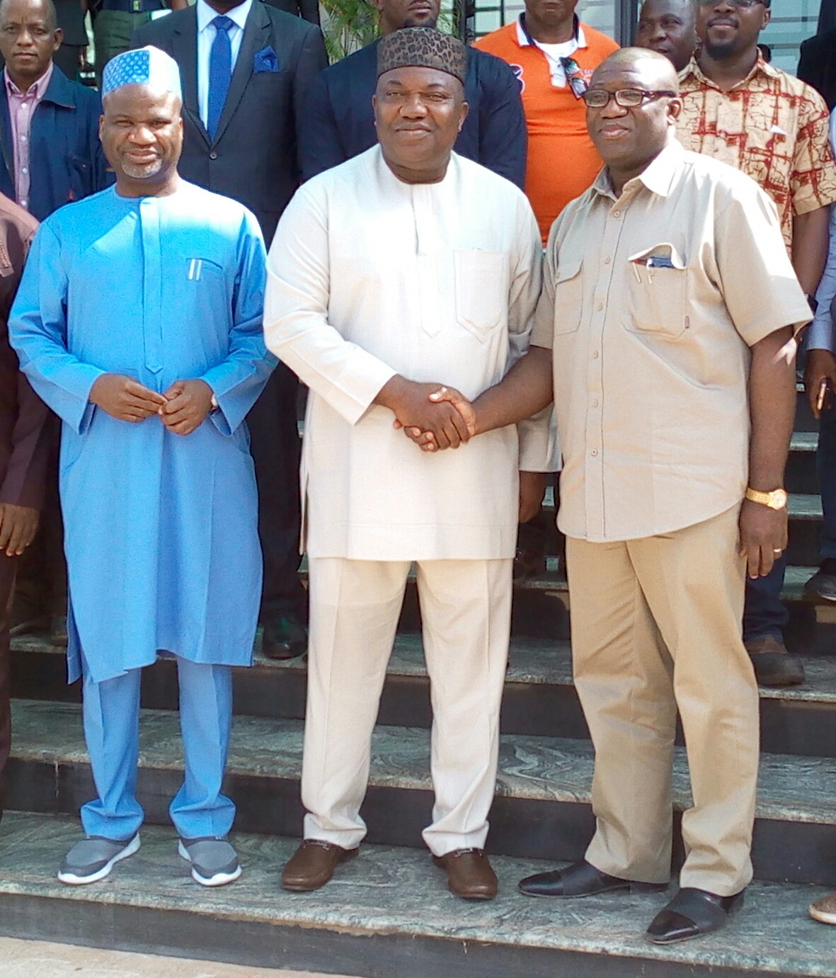 Gov. Ifeanyi Ugwuanyi of Enugu State (middle) with the Minister of