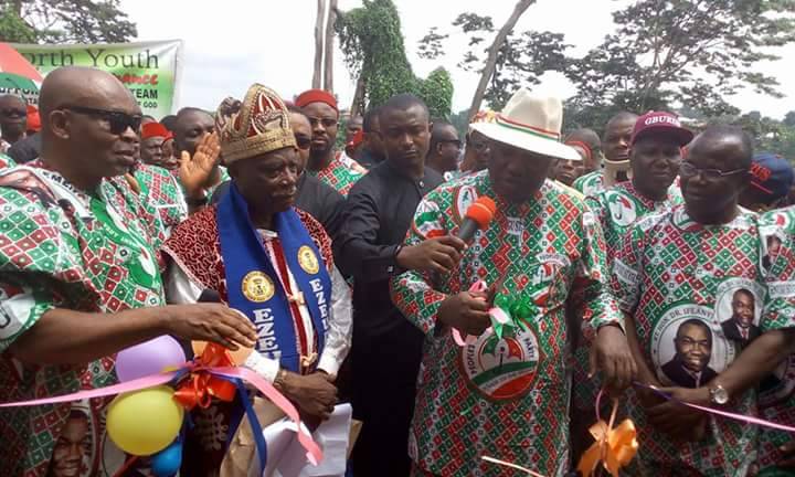 Governor Ifeanyi Ugwuanyi of Enugu State (middle) cutting a tape to inaugurate the ultra-modern civic centre in Enugu-Echi Ihe, Awgu Local Government Area constructed with the first tranche of N5m released to each of the 450 communities in the state. With him are the State Chairman of the Peoples Democratic Party (PDP), Hon. Augustine Nnamani (right); Rt. Hon. Toby Okechukwu and the traditional ruler of the community, HRH, Igwe Godwin Ekoh, among others.