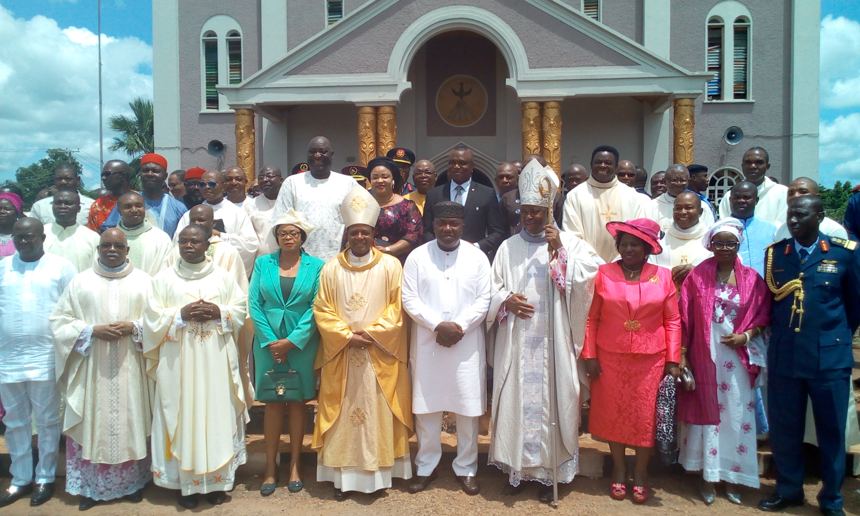 Governor Ifeanyi Ugwuanyi of Enugu State (middle), with his deputy, Mrs. Cecilia Ezeilo (4th left); Speaker of the State House of Assembly, Rt. Hon. Edward Ubosi (5th left behind); Chief Judge of the State, Hon. Justice Ngozi Priscilla Emehelu (3rd right); Catholic Bishop of Enugu Diocese, Most Rev. Callistus Onaga (4th right); Bishop Godfrey Onah of Nsukka Diocese (5th left); Heads of Security Agencies, others at the 2018 Democracy Day Thanksgiving Mass held at the Holy Ghost Cathedral, Enugu, yesterday.