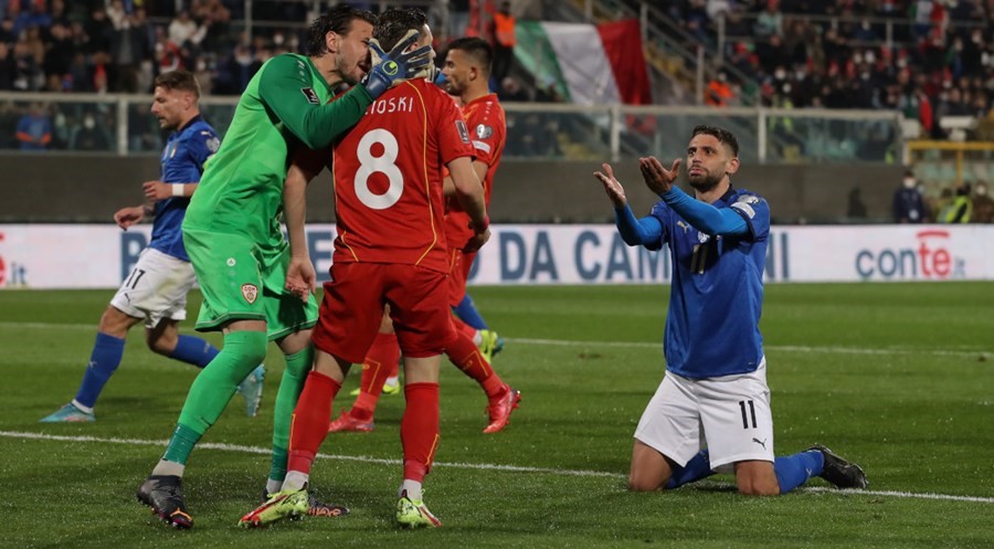 Aleksandar Trajkovski’s low drive in the second minute of stoppage time stunned the European champions in Palermo and set-up a qualifying final with Portugal in Porto on Tuesday for a chance to be in Qatar in November.