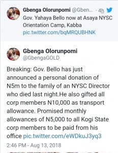 According to Gbenga Olorunpomi, his Senior Special Assistant (Elecrronic Media), who tweeted the information on Monday, Bello also announced a personal donation of N5m to the family of an NYSC Director who died on Sunday night.