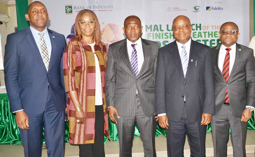 L-R: Head, Corporate Bank, Fidelity Bank Plc, Obaro Odeghe; Executive Director, Bank of Industry (BoI), Toyin Adedeji; Managing Director, Bank of Industry, Olukayode Pitan; Permanent Secretary, Federal Ministry of Industry Trade and Investment, Edet Akpan; Divisional Head, Managed SMEs, Fidelity Bank Plc, Osaigbovo Omorogbe at the formal launch of the Aba Finished Leather Goods Cluster Finance Scheme supported by Fidelity Bank, which held in Aba on Wednesday.