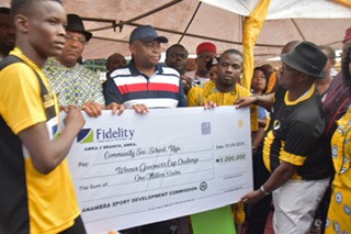 L-R: Team captain of Community Secondary School, Uga, receiving dummy cheque of N1, 000,000 from Dr Nkem Okeke, deputy governor, Anambra State and Mr. Nnamdi Okonkwo, MD/CEO, Fidelity Bank Plc and Mr. Tony Chuma Oli, chairman, Anambra State Sports Development Commission, at the finals of the U13 and U17 Academicals Championships organized by Anambra State Sports Development Commission, sponsored by Fidelity Bank Plc held at St Mary’s High School, Ifitedunu, Anambra State, weekend.