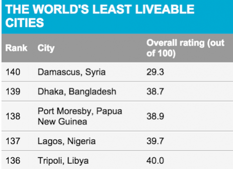 Nigeria’s most populous city Lagos was considered the fourth least (137) liveable city in the world on the list of 140. The survey took account of cities’ healthcare, education, safety, culture, environment and infrastructure.