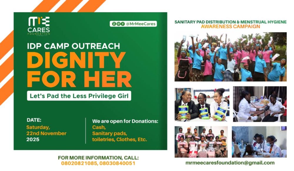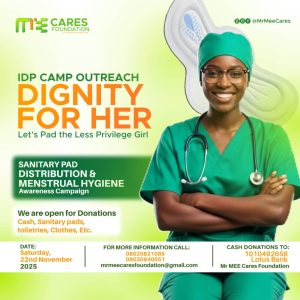 An Outreach event titled “Dignity For Her” has been scheduled for Saturday November 22, 2025 at 10am at Kuchingoro IDP Camp Games Village Abuja, for distributions of supplies.
