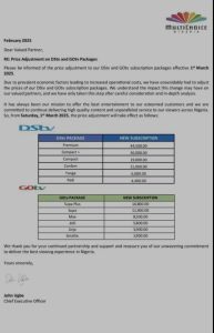 The company revealed this in a statement to customers on Monday titled, “Price adjustment on DStv and GOtv packages” and signed by the CEO John Ugbe.