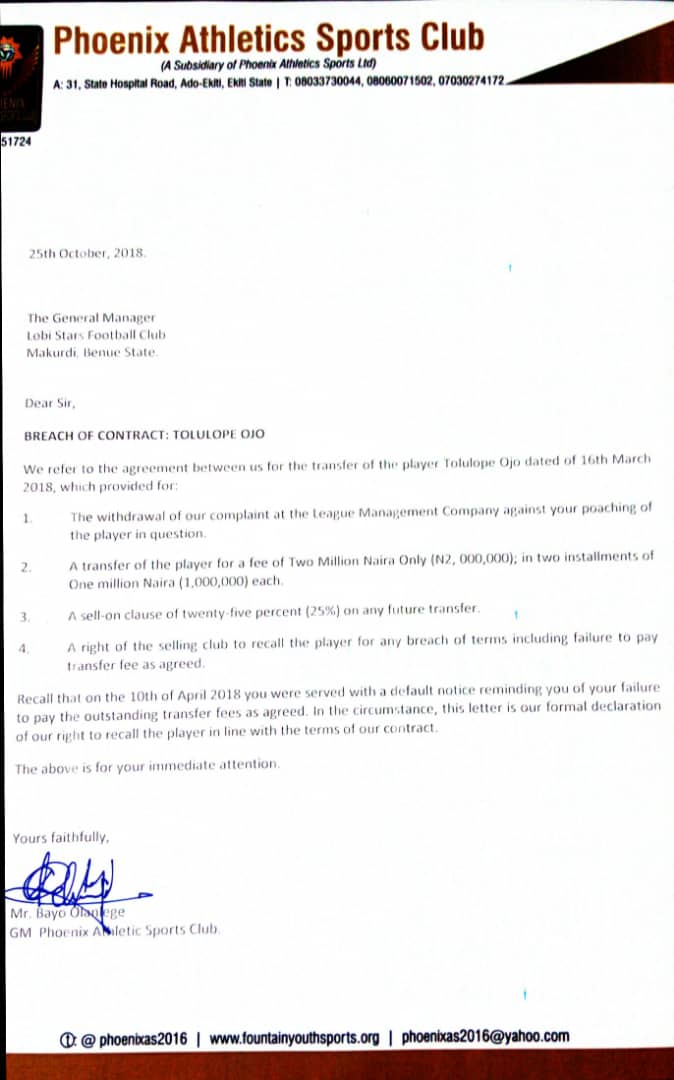 According to the letter of intent to withdraw the player and made available to the press, Lobi stars reneged from the contract agreement after an initial letter of complaint against the Makurdi based for allegedly poaching was withdrawn from the League Management Company.