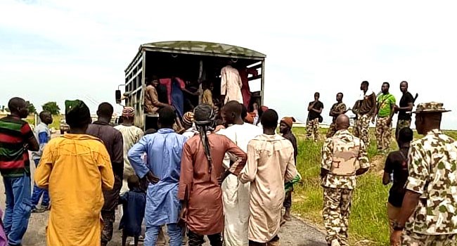 A photo released by the Nigerian Army on August 16, 2021, shows some of the repentant Boko Haram fighters who surrendered to troops in Borno State.