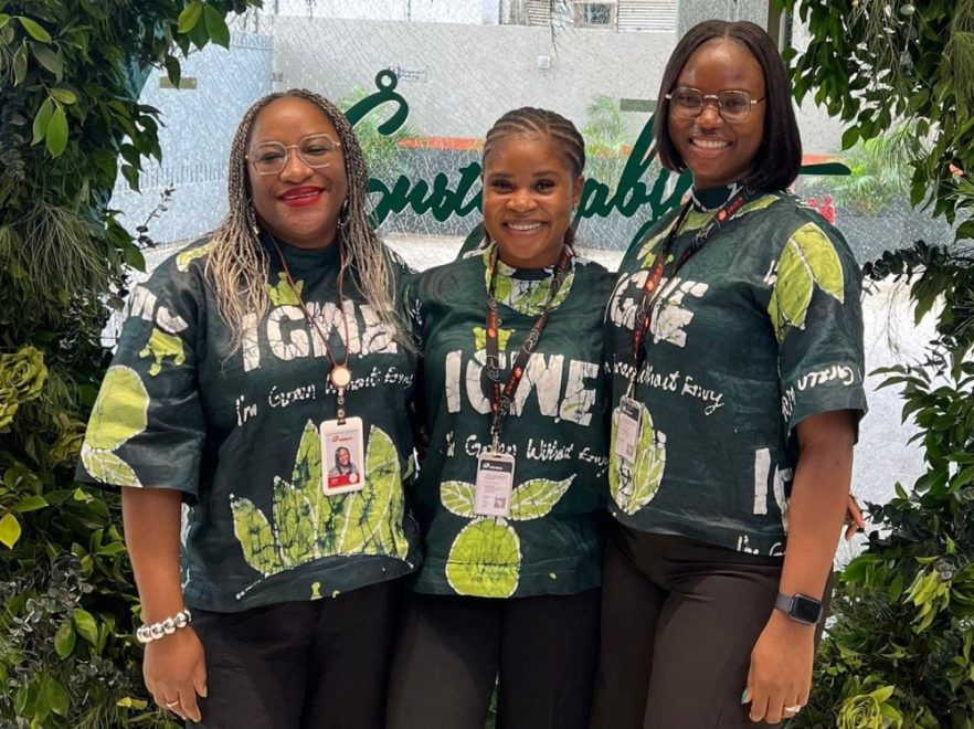L-R: Ejiro Gray, Director of Governance and Sustainability, Lauretta Eguabor, Governance and Sustainability Executive, Tejumade Tejuoso, Governance and Sustainability Manager during the launch of “I’m Green Without Envy” (IGWE), a platform that gamifies sustainability to encourage eco-friendly habits across Sahara Group locations in Africa, Asia, Europe, and the Middle East.