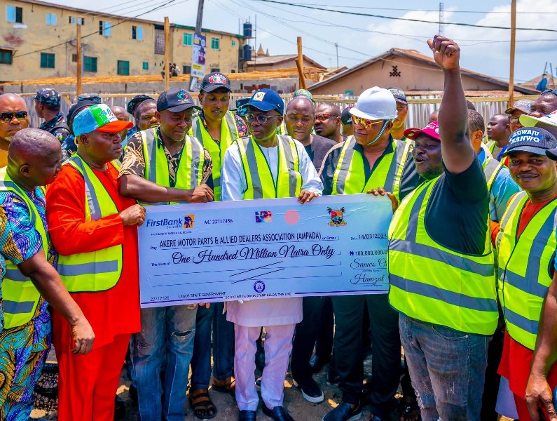 Lagos State Governor, Babajide Sanwo-Olu on Wednesday donated N100 million to traders in the burnt Akere Motor Parts and Allied Dealers Association (AMPADA) market in the Ajegunle area of the State.