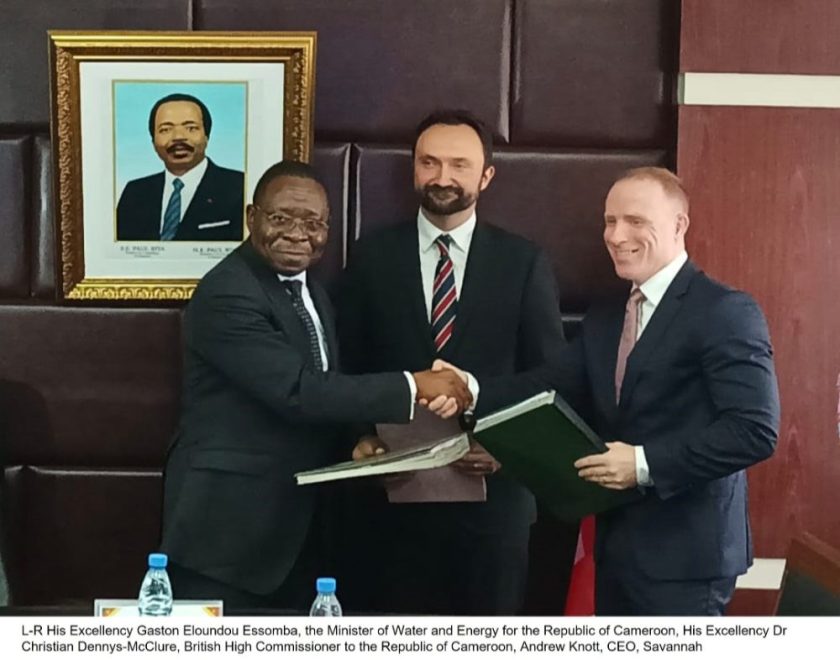 A signing ceremony was held today in Yaounde, attended by His Excellency Gaston Eloundou Essomba, Minister of Water and Energy for the Republic of Cameroon, His Excellency Dr Christian Dennys-McClure, British High Commissioner to the Republic of Cameroon and Andrew Knott, Chief Executive Officer of Savannah.