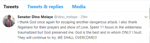 On his twitter handle, @dino_melaye, he said, “I thank God once again for escaping another dangerous attack. I also thank Nigerians for their prayers and show of Love. Spent 11 hours in the wilderness traumatized but God preserved me. God is the best and in whom ONLY I trust. They will continue to try. WE SHALL OVERCOME!!!”