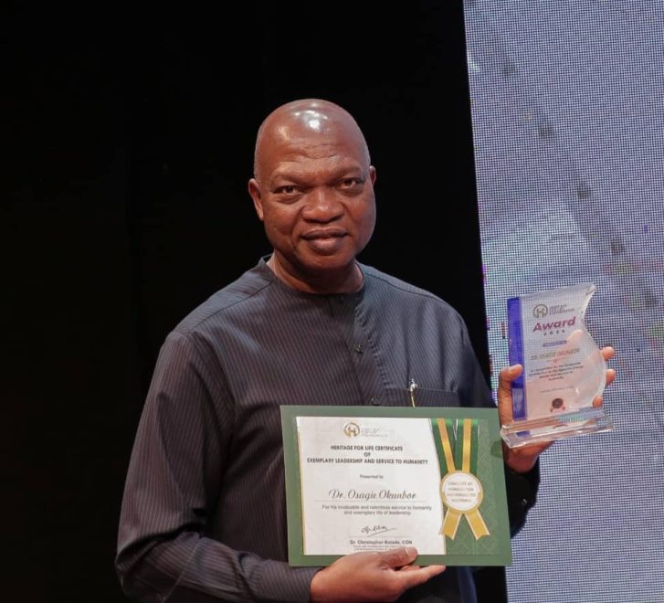 Osagie received the Award for Exemplary Leadership and Service to Humanity from a Lagos-based NGO, Heritage for Life Foundation, at a ceremony held in Lagos.