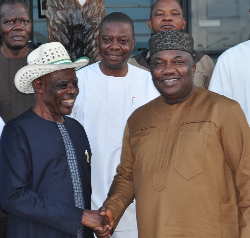 Solidarity visit: Governor Ifeanyi Ugwuanyi of Enugu State, (right) in a handshake with the leader of Nsukka General Assembly, Prof. Lawrence Ocho, when the latter led a delegation of his assembly on a solidarity visit to the governor over the Fulani herdsmen attack on Nimbo, at Government House, Enugu yesterday.