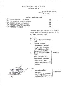 The appeal ruled upon by the Supreme Court was filed by the PDP, its governorship and deputy governorship candidates of the party, who had alleged in their suit originated at the Federal High Court in Abuja that Degi-Eremienyo presented to INEC, documents of academic qualifications with about nine variations of names different from the name that appeared on his Form CF001 submitted to the electoral commission.