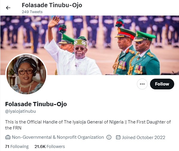A check on her Twitter bio reads, “This is the Official Handle of the Iyaloja General of Nigeria. The First Daughter of the FRN.”