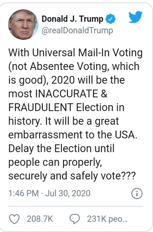 In a series of tweets, Mr Trump said “universal mail-in voting” would make November’s vote the “most inaccurate and fraudulent election in history” and a “great embarrassment to the USA”.