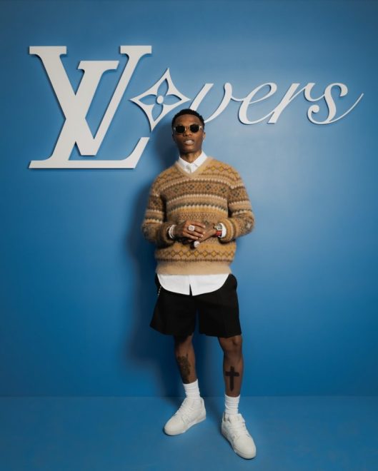 For the Louis Vuitton show, Wizkid sported a fresh look from the pre-SS25 collection, featuring a V-neck Fair Isle jumper, tailored shorts, and a shirt. He personalised the outfit by swapping the lookbook’s collegiate tie for an ivory one and opting for white sneakers instead of loafers.