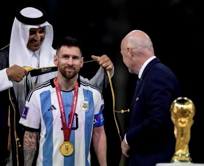 Before the FIFA President, Gianni Infantino handed the trophy to the seven times Ballon d’Or winner, Qatar’s emir, Sheikh Tamim bin Hamad Al Thani put a black robe called Beshth on him (Messi).